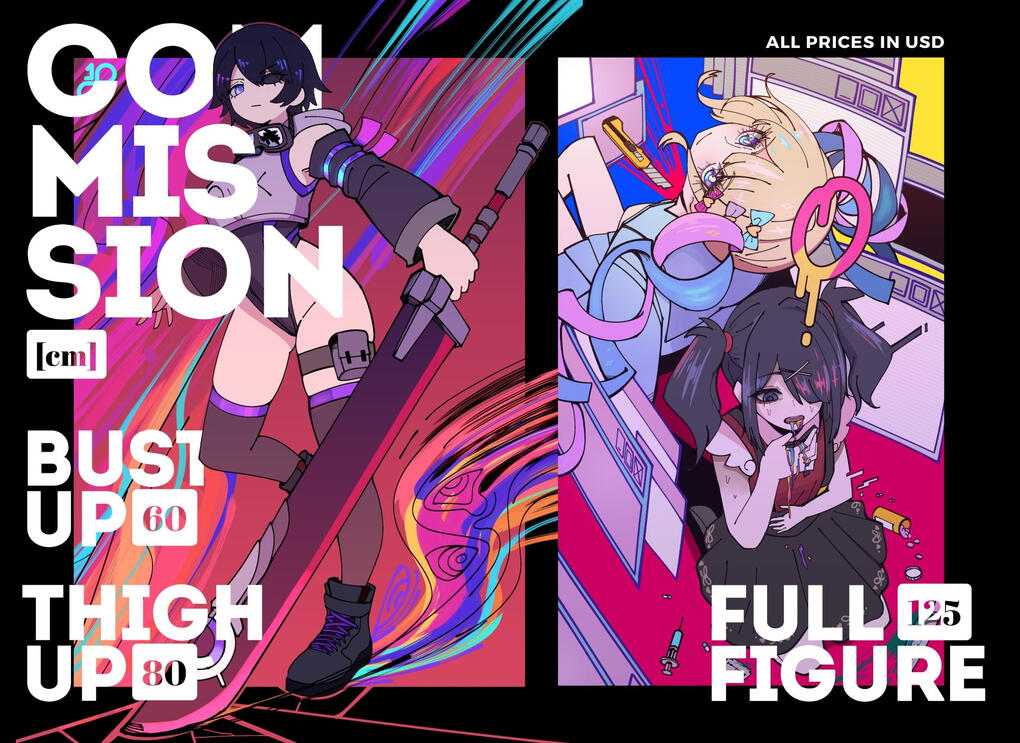 + I hold the right to reject any order which I feel uncomfortable for any reason.+ For promotional purposes, commissioned artworks posted publicly (watermarked). To keep it private or to keep your identity anonymous, please notify me beforehand.+ My commissioned artworks are not to be adjusted without prior notice. This means no changing details or colors. If you use the commission as it is on your personal non-profit projects, feel free!+ Credits are not mandatory, but appreciated. However, I will not tolerate stealing credit and claiming the work.+ My style is primarily anime-oriented, so I'd only accept anime commissions.+ All payments through PayPal. Full payment is done after the client approves of sketch. No refunds!+ References are required. To ensure you get what you really want, the more specific the better.+ My drawing will not be used for NFTs or AI-generation.+ Dos: anime-oriented style, mecha, furries, relatively vanilla NSFW.+ Don'ts: extreme fetishes, hate speech. real people.+ For commissions under commercial purposes, please contact me.